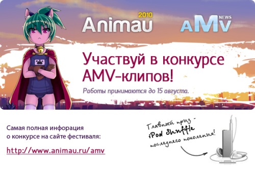 Animau 2010 - это четвертый всероссийский фестиваль аниме и манги, проходящий в г. Уфе (состоится 21 августа). В рамках программы фестиваля совместно с порталом AMVNews.ru пройдет конкурс AMV-клипов. Работы принимаются до 15 августа включительно. Ограничений на тематику нет. Эксклюзивность не требуется, но не допускаются работы, победившие на других конкурсах. Так что если у вас есть хорошая работа, которая ещё не взяла призов, то не поленитесь и отправьте её на конкурс. Победителей ожидают ценные призы, среди которых главный приз - iPod Shuffle последнего поколения!